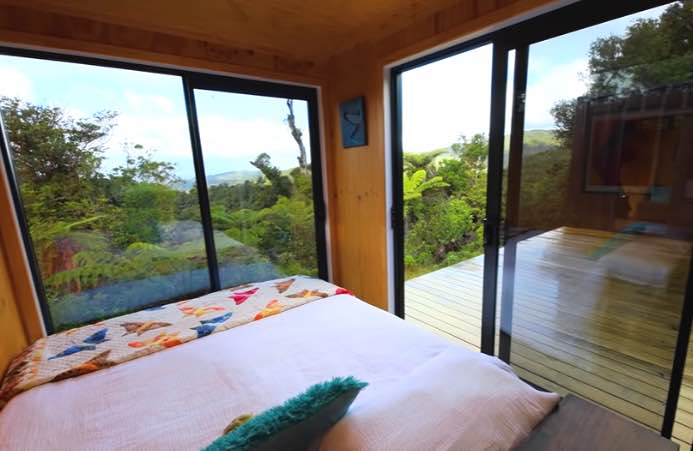 Il bagno è discreto ma confortevole e Rosie ha deciso di incorporare al suo interno un’ampia zona doccia, abbastanza grande da ospitare una sedia e maniglie che fungono da portasciugamani. Infine, nella camera da letto, si trova un grande letto con vista sulla natura. L’area offre lo spazio sufficiente per ospitare un letto king-size mentre il pannello di vetro che svetta dal pavimento al soffitto su entrambi i lati del muro assicura una vista mozzafiato dell’alba.